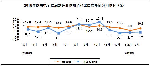 2019年一季度,规模以上电子信息制造业增加值同比增长7.8%,增速同比回落4.7个百分点;出口交货值同比增长2.9%,增速同比回落6.7个百分点。其中,3月份规模以上电子信息制造业增加值同比增长10.2%,出口交货值同比增长3.2%。
